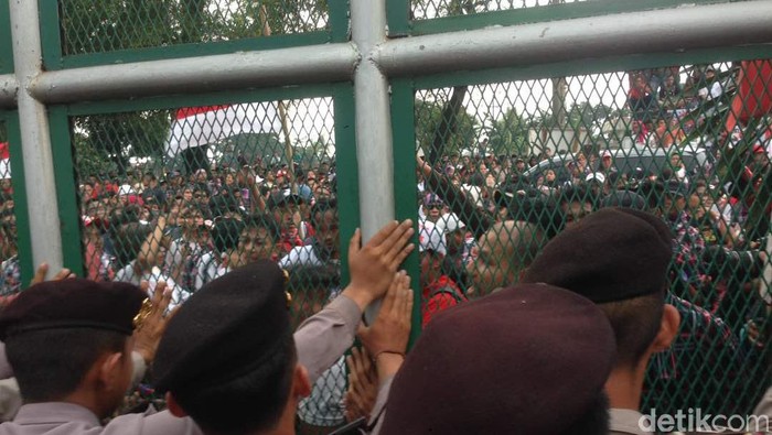 Massa pendukung bersikeras untuk bisa bertemu dengan Basuki Tjahaja Purnama (Ahok) di Rutan Cipinang. Selain mendorong pagar mereka kini mulai melemparkan botol air mineral ke arah petugas.