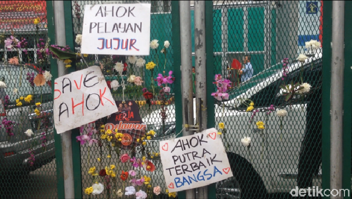 Namun di depan pagar masih banyak terdapat karangan bunga dukungan untuk Ahok. Karangan bunga tersebut nampak berjajar dengan rapi. Sesekali ada penguna jalan yang berhenti hanya untuk sekadar berswafoto.