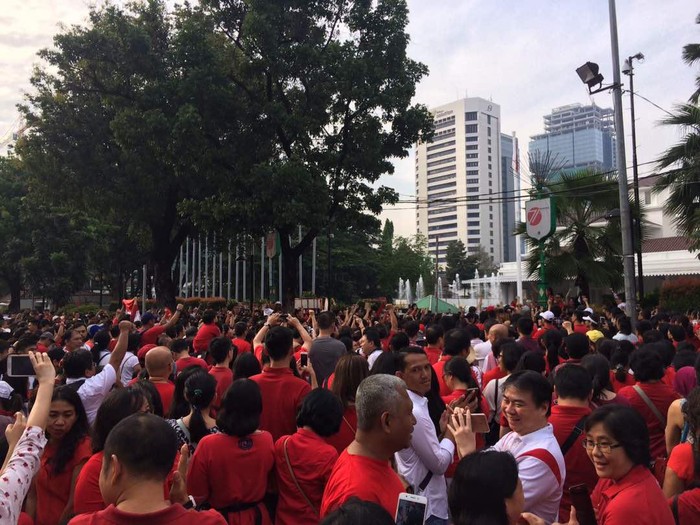 Pantauan di Jl Medan Merdeka Selatan, Gambir, Jakarta Pusat, sekitar pukul 07.20 WIB, sejumlah orang yang memakai pakaian berwarna merah-putih berkumpul di depan gerbang Balai Kota. Mereka mengaku mendapat pesan berantai di aplikasi pesan WhatsApp agar berkumpul di Balai Kota.