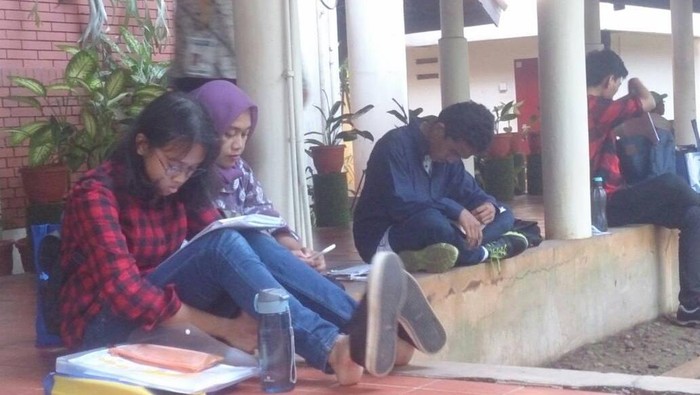 Sambil menunggu waktu dimulainya tes jurusan soshum, banyak dari mereka yang mengisi waktu dengan belajar di lorong UI. Di antara dari mereka ada juga yang diantar oleh orang tuanya.
