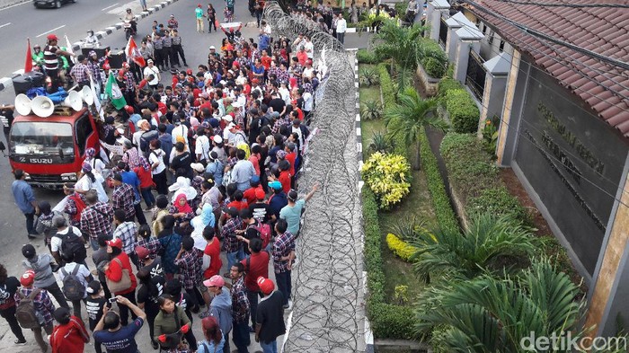 Terdapat pagar kawat berduri yang membatasi gedung PT DKI dengan massa yang sedang menggelar aksi. Sedangkan lalu lintas di depan PT DKI terpantau ramai-lancar.