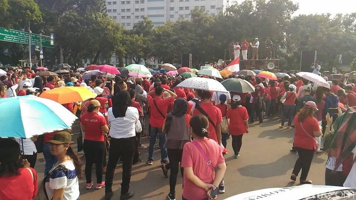 Pantauan detikcom di lokasi, Jl Silang Monas Barat Laut, Gambir, Jakarta Pusat, Sabtu (20/5/2017), mayoritas mengenakan kaus merah dan putih dengan hiasan stiker #gentapancasila di dada mereka. Massa juga membawa payung atau mengenakan topi guna melindungi tubuh, terutama kepala, dari terik matahari.