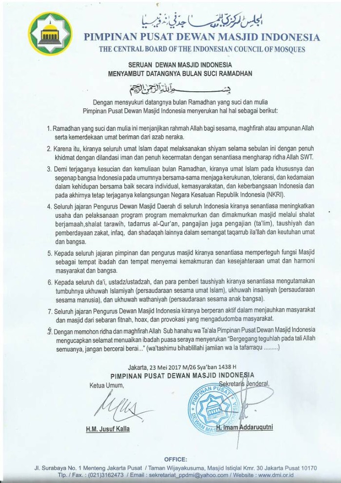 8. Dengan memohon ridho dan magfirah Allah Subhanahu wa Ta'ala, Pimpinan Pusat Dewan Masjid Indonesia mengucapkan selamat menunaikan ibadah puasa seraya menyerukan 'Berpegang teguhlah pada tali Allah semuanya, jangan bercerai-berai..." (wa'tashimu bihablilahi jamiian wa la tafarraqu...).