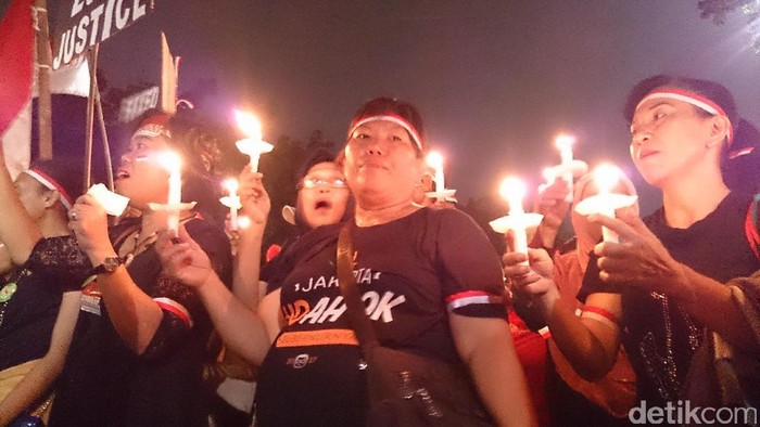 Pantauan di depan Balai Kota DKI, Jalan Medan Merdeka Selatan, Gambir, Jakarta Selatan, Rabu (24/5/2017), massa mulai membakar lilin pukul 18.00 WIB. Massa kompak mengangkat lilin dengan posisi berdiri.