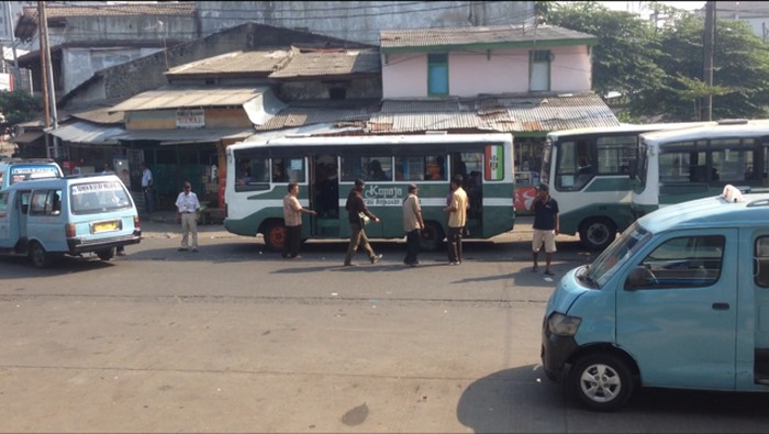 Bus dan angkot di Kampung Melayu sibuk menaikkan dan menurunkan penumpang. Foto: Ibnu Hariyanto/detikcom