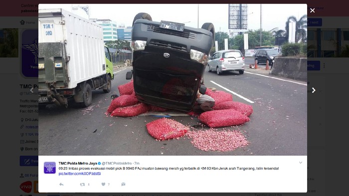 Dari akun twitter resmi Traffic Management Center (TMC) Polda Metro Jaya mobil berwarna hitam tersebut tengah dalam penanganan petugas. Muatan bawang merah dari mobil bernomor polisi B 9948 FAJ tersebut masih berceceran di jalan tol. (jbr/bpn)