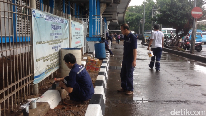 Pantauan detikcom di Halte TransJakarta Kampung Melayu, Jakarta Timur, puluhan petugas dari tim sarana dan prasarana TransJakarta terlihat sibuk memperbaiki seluruh bagian halte, Senin (29/5/2017). Para petugas tersebut masing-masing memiliki tugas yang berbeda.