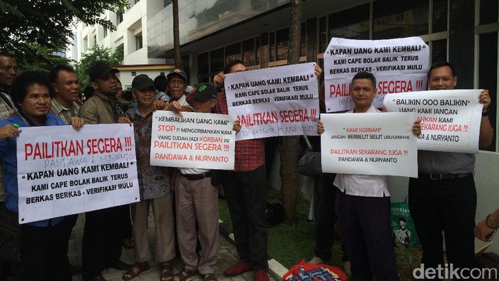 Sementara itu sejumlah nasabah Pandawa beraksi membawa poster-poster. Mereka menyuarakan dipailitkannya Pandawa demi kembalinya dana investasi yang sebelumnya disetorkan.