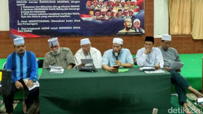 "Khusus untuk penetapan tersangka kepada Habib Rizieq dan rencana kepulangan beliau ke Tanah Air maka kami Presidium Alumni 212 bersama tim pembela ulama mengajak ormas-ormas Islam lainnya dan juga komponen masyarakat yang cinta ulama untuk mengibarkan bendera setengah tiang sebagai simbol matinya keadilan di negeri ini," ujar Ketum Presidium Alumni 212, Ansufri Sambo dalam jumpa pers di Masjid Baiturrahman, Jl Saharjo, Tebet, Jaksel, Rabu (31/5/2017).