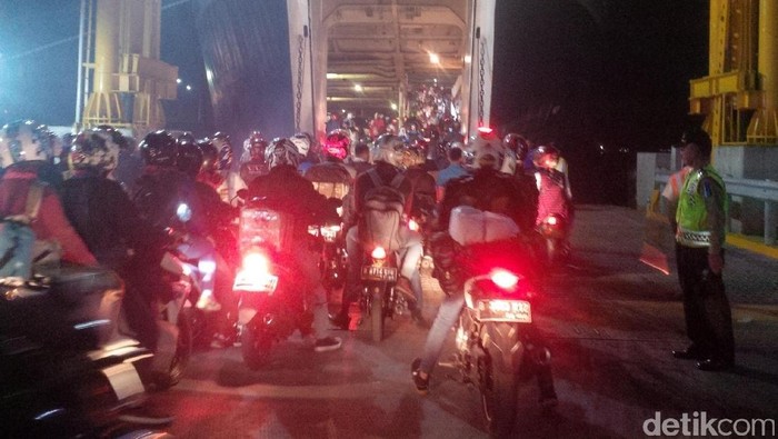 Pemudik pemotor dialihkan ke dermaga lain untuk mengurai kepadatan yang terjadi di Dermaga VI Pelabuhan Merak. Volume kendaraan yang besar membuat petugas langsung memberlakukan penguraian ke beberapa dermaga.