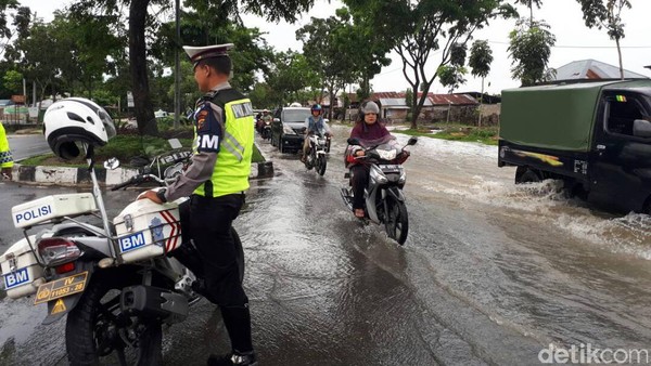 Di jalan tersebut, air meluap dari drainase yang tak mampu menampung curah hujan. Di jalanan ini, banyak kendaraan roda dua yang mogok.