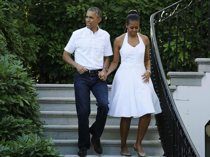 Obama disusul oleh istrinya, Michelle Obama, yang mengenakan sweater lengan panjang warna putih dipadu celana panjang warna biru muda. Kemudian dua putri Obama, Malia Ann Obama dan Natasha Obama, serta 10 orang rombongan menyusul di belakang.