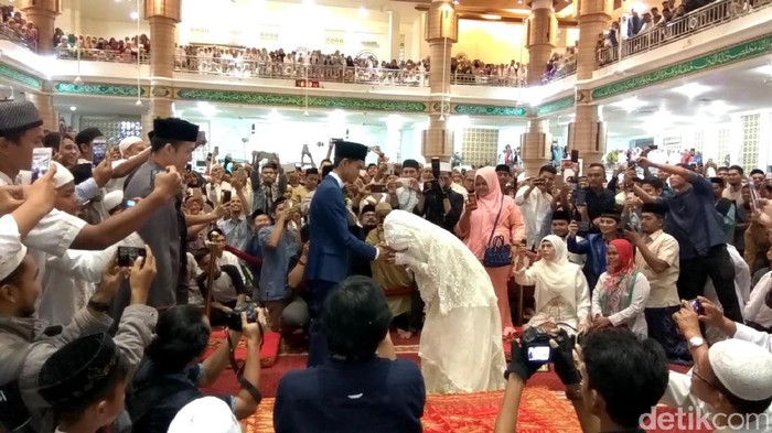 "Boleh salam. Suami-istri boleh salam. Cium tangan suami. Alhamdulillah, alhamdulillah," kata pembawa acara pada prosesi pernikahan melalui alat pengeras suara.