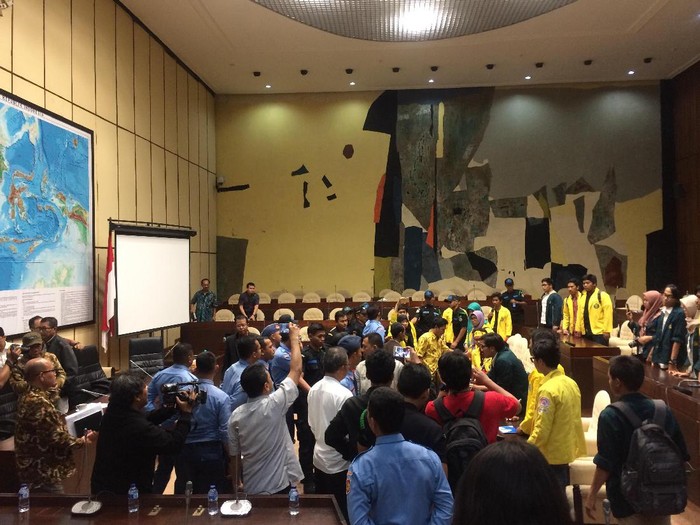 Sontak, suasana di dalam ruangan memanas. Langsung saja, Ketua Pansus Hak Angket KPK Agun Gunandjar menjelaskan alasan mereka tidak bisa menemui para mahasiswa.