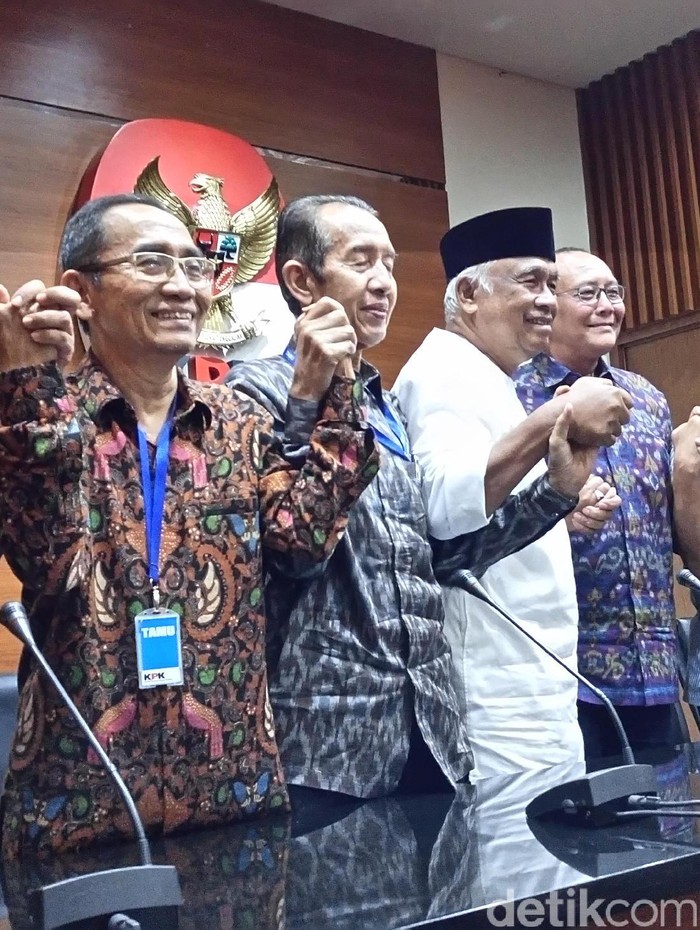 Dalam pernyataan dukungan eks pimpinan KPK hari ini, turut hadir mantan Ketua KPK Tumpak Hatorangan Panggabean serta mantan Wakil Ketua KPK Zulkarnain, Adnan Pandu Praja, dan Chandra M Hamzah. Ada pula mantan Deputi Penindakan KPK Ade Rahardja, mantan Deputi Pencegahan KPK Erry Riyana Hardjapamekas, juga Eko Soesamto Tjiptadi. (nif/jor)