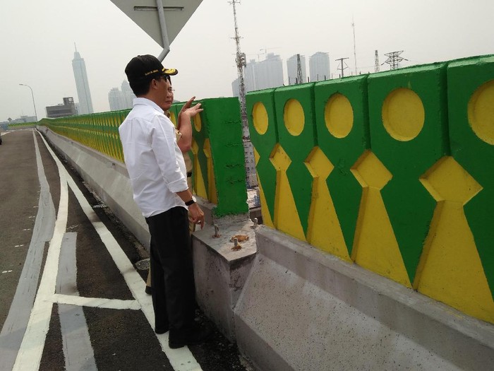 Saat melakukan tinjauan, Tony didampingi Kepala Dinas Bina Marga DKI Jakarta Yusmada Faizal. Keduanya melihat tembok pembatas jalan yang belum tersambung.