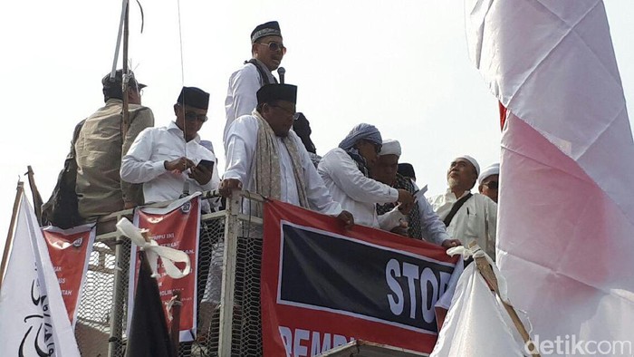 Slamet awalnya menyampaikan salam dari imam besar FPI Habib Rizieq Syihab, yang masih berada di Saudi. Slamet mengajak massa mendoakan Rizieq.