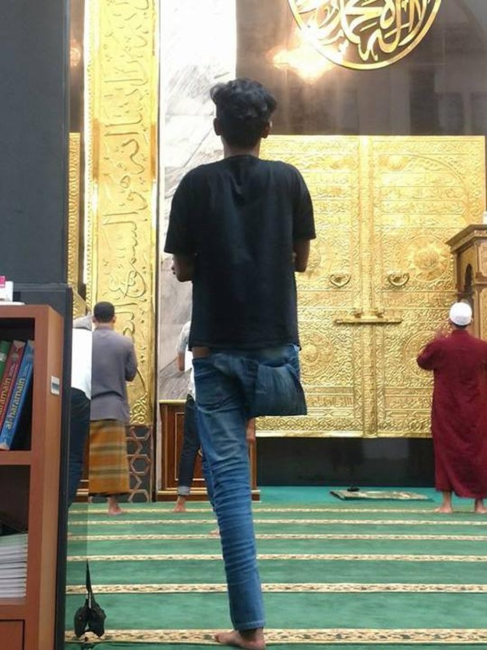 Pemuda difabel menjalankan salat berjemaah. (Facebook Mohamad Gunadi)