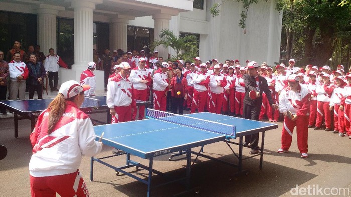 Pertandingan tenis meja ini dilakukan di halaman tengah Istana Kepresidenan, Jl Medan Merdeka Utara, Jakarta, Senin (7/8/2017) pagi. Mereka bermain dengan berpasangan, Jokowi-Erick melawan Susy-Yopie.