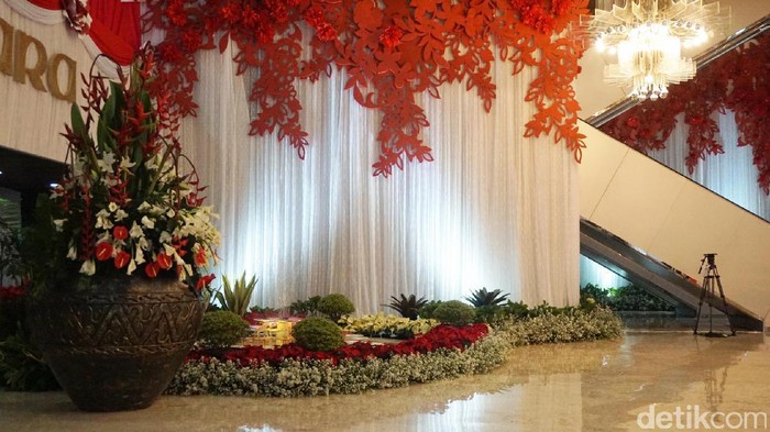 Nuansa merah dan putih tampak cantik menghiasi lantai dasar Gedung Nusantara atau yang biasa disebut Gedung Kura-kura pada Rabu (16/8/2017). Dekorasi bunga-bunga semakin menambah keindahannya.