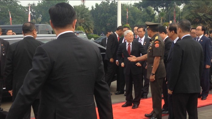 Nguyen terlihat turun dari mobil sedan berwarna hitam dengan nomor polisi Vietnam. Dia datang bersama para delegasi Vietnam.