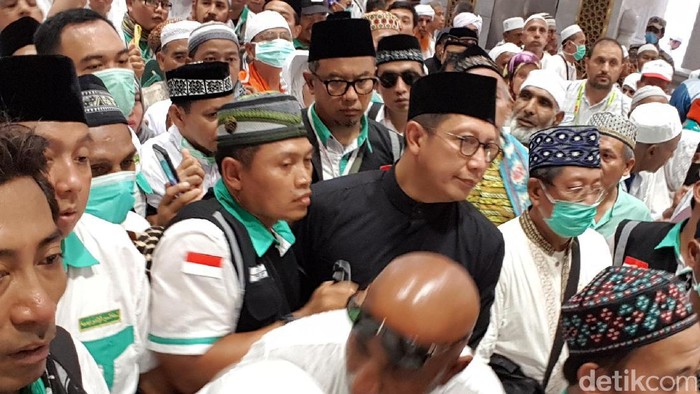 Dikawal 1-2 petugas, Menag bergerak bersama jemaah dari Indonesia dan negara lain. Desak-desakan terjadi di beberapa titik. Sampai-sampai Menag bercucuran keringat.
