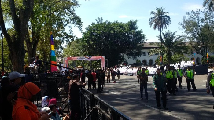 Berdasarkan pantauan detikcom di area depan Gedung Sate, Jalan Dipenogoro, Kota Bandung, terlihat pihak panitia masih memasang panggung untuk tim paduan suara dari Universitas Parahyangan (Unpar). Selain itu, di area lokasi tampak tim paduan suara Unpar tengah menjalani latihan.