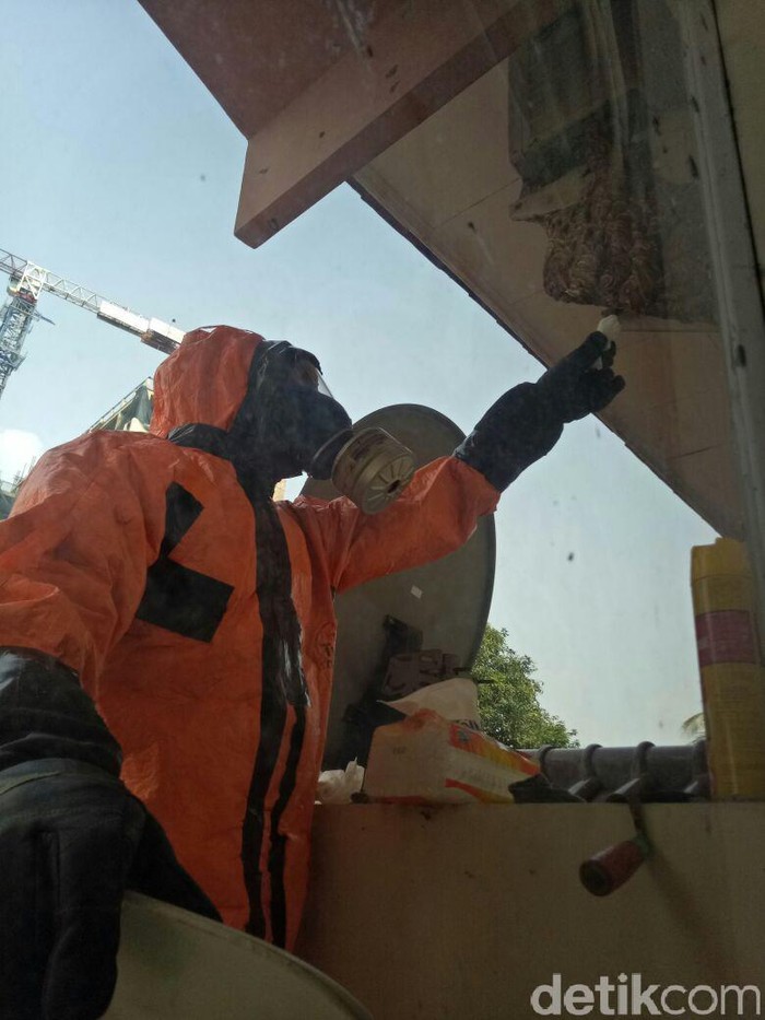 Sarang tawon yang dievakuasi berada di penyangga mesin AC dekat plafon rumah. Tim Damkar juga menggunakan penyemprot anti serangga saat memindahkan sarang tawon.