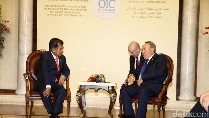 Pertemuan keduanya dilaksanakam di Independence Palace Astana, Minggu (10/9/2017). JK dan Nursultan membahas upaya peningkatan hubungan bilateral khususnya bidang ekonomi. Kedua pihak sepakat untuk mendorong peningkatan arus perdagangan dan investasi dua arah.