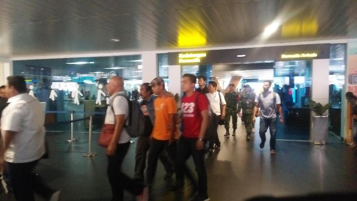 DI, yang mengenakan pakaian berwarna oranye dengan topi motif kotak-kotak berwarna cokelat, terus berjalan ke luar bandara. DI langsung dibawa petugas Satreskrim Polrestabes menggunakan mobil berwarna putih.
