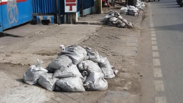 Pantauan detikcom, karung-karung berwarna putih itu ditumpuk di trotoar Jalan Latumenten, Tambora, Jakarta Barat. Mobil pengangkut dari Sudin SDA Jakbar disiapkan untuk mengangkut karung-karung itu.
