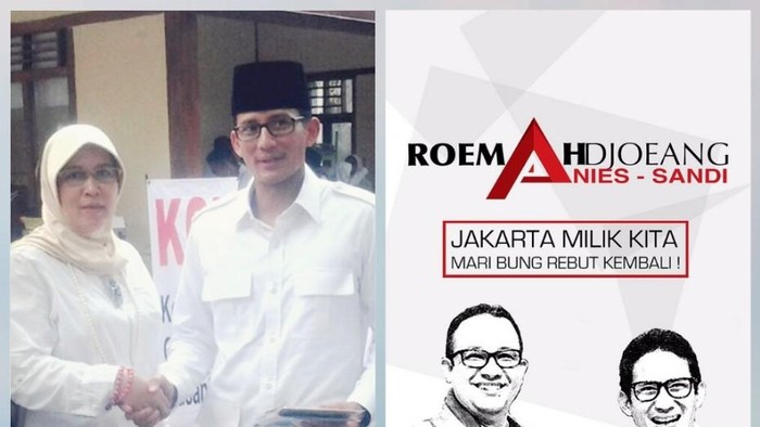 Asma Dewi mengunggah foto dia bersalaman dengan Sandiaga yang digabungkan dengan logo 'Roemah Djoang Anies-Sandi'. Selain dengan Sandiaga, Asma Dewi mengunggah foto bersama Ketum Gerindra Prabowo Subianto dan Ahmad Dhani.