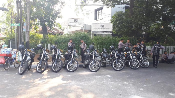 Tidak terlihat mobil water canon maupun barracuda. Namun ada beberapa motor petugas kepolisian berbaris serta pos kepolisian yang dibangun berada di depan kantor YLBHI sisi utara.