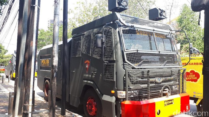 Pantauan detikcom di Jalan Pangeran Diponegoro, Menteng, Jakarta Pusat, Senin (18/9/2017), pada pukul 10.22 WIB, 3 mobil water cannon disiagakan. Mobil water cannon ini terparkir di seberang halte Megaria, Jalan Diponegoro.