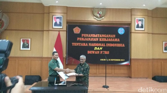 Penandatanganan MoU itu digelar di Mabes TNI, Cilangkap, Jakarta Timur, Senin (25/9/2017). MoU ditandatangani oleh Kepala Pusat Penerangan TNI Mayor Jenderal TNI Wuryanto dengan Wakil Ketua Dewan Pers Ahmad Djauhar.