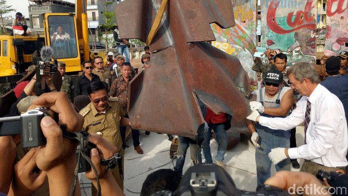 "Jadi ini tembok yang bisa menahan gempuran tank dan senjata, tapi akhirnya roboh karena tangan-tangan manusia yang ingin bersatu. Jadi ini juga ada patung bajanya simbol itu," sambungnya.