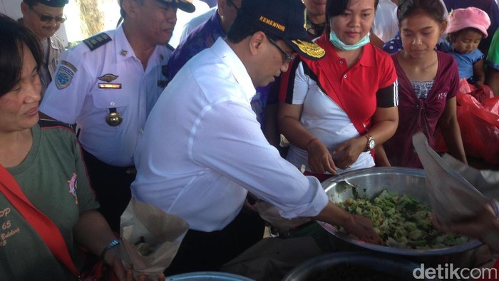 Budi tiba di Pos Pengungsi GOR Swacepura, Gelgel, Klungkung, Bali, pukul 10.00 Wita Kamis (28/9/2017). Budi datang bersama rombongan Kementerian Perhubungan.