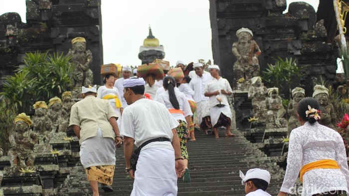 Pantauan detikcom di pura yang terletak di Besakih, Karangasem, Bali, Kamis (5/10/2017) pukul 10.00 WITa, warga dari berbagai daerah di Bali tetap berdatangan menapaki tangga menuju tempat sembahyang. Canang hingga dupa telah disiapkan dan para pemuka agama Hindu-Bali telah membacakan sejumlah doa.