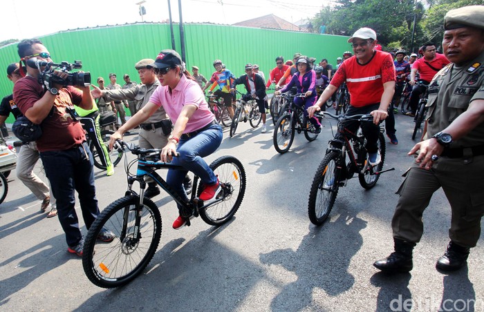 Berdasarkan pantauan detikcom, Sabtu (7/10/2017), Djarot beserta istrinya, Happy Farida, menggowes sepeda sejauh 5,4 kilometer.