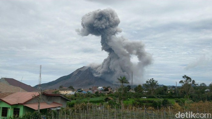 "Pos Pengamatan Gunung Sinabung PVMBG melaporkan letusan dengan tinggi kolom abu vulkanik 2.000 meter yang diikuti awan panas guguran, dengan jarak luncur 1.500 meter ke arah selatan dan 2.000 meter ke arah timur-tenggara. Angin bertiup lemah-sedang ke arah timur-tenggara. Lama gempa erupsi 366 detik," kata Kepala Pusat Data Informasi dan Humas BNPB Sutopo Purwo Nugroho lewat keterangannya, Kamis (12/10/2017).