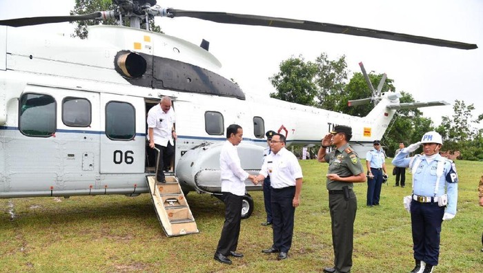 Pantauan detikcom, Jumat (13/10/2017) Jokowi bertolak ke Banyuasin menggunakan helikopter Super Puma milik TNI AU dari Bandara Sultan Mahmud Badaruddin II Palembang, Sumatera Selatan sekitar pukul 08.40 WIB. Jokowi ditemani oleh Gubernur Sumatera Selatan Alex Noerdin.