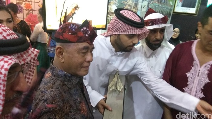 Dari stan Aljazair, Menhan diberi kenang-kenangan berupa miniatur pesawat tempur. Selanjutnya Menhan menghampiri stan Arab Saudi. Di sana Ryamizard ditawari air zamzam sampai kurma.