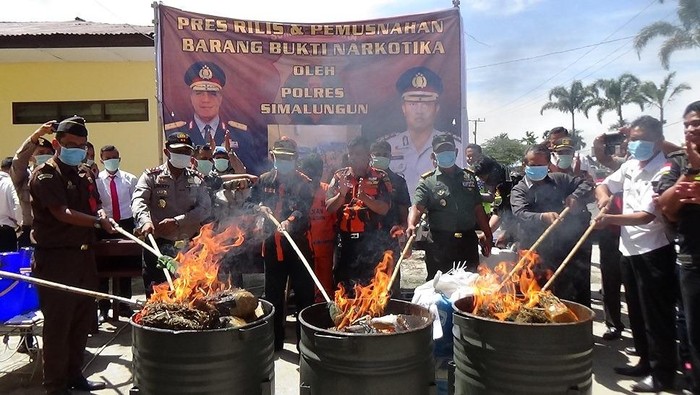 Foto: Polres Simalungun, Sumatera Utara memusnahkan barang bukti ratusan kilogram ganja (Mei Amelia Rahmat/detikcom) |