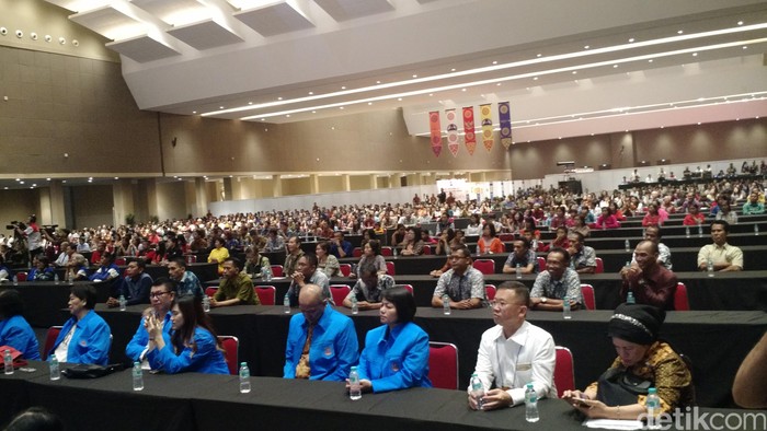 Ratusan orang di ruangan, termasuk di antaranya para biksu dan biksuni, menyambut Jokowi dengan berdiri dan bertepuk tangan. Dia kemudian berhenti di barisan kursi terdepan.