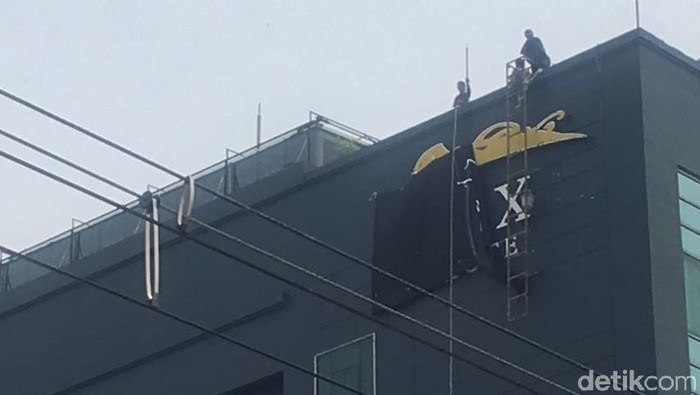 Saat ini proses pembongkaran plang masih berlangsung. Terlihat huruf I dan S sudah terlepas dari tempatnya. Nantinya para petugas juga akan mencopot plang hotel yang ada di sisi kanan belakang gedung berkelir hitam ini.