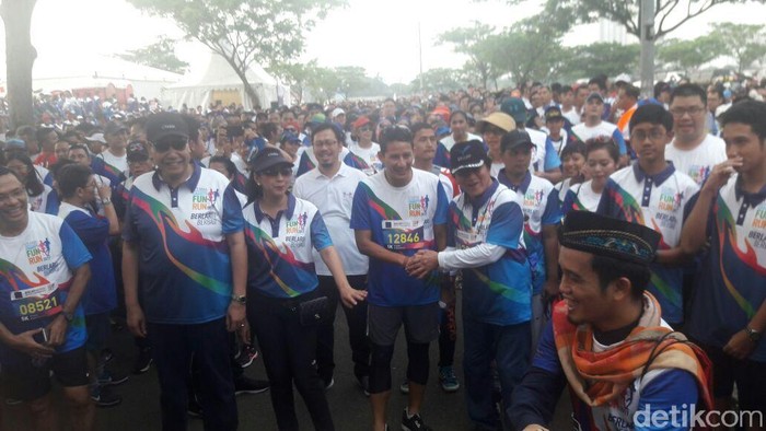 Begitu tiba, Sandi disambut dengan sejumlah peserta lari. Sandi tampak ramah menyapa dan menyalami para peserta tersebut.