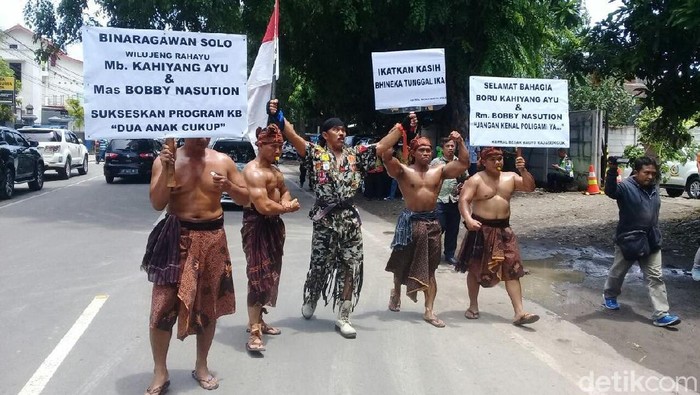 Mengatasnamakan Binaragawan Solo, kelima orang ini bersahut-sahutan mengucapkan selamat atas pernikahan puteri Presiden Joko Widodo Kahiyang Ayu dengan Bobby Nasution. Sembari memegang poster, mereka ikut menunjukkan otot-otot.