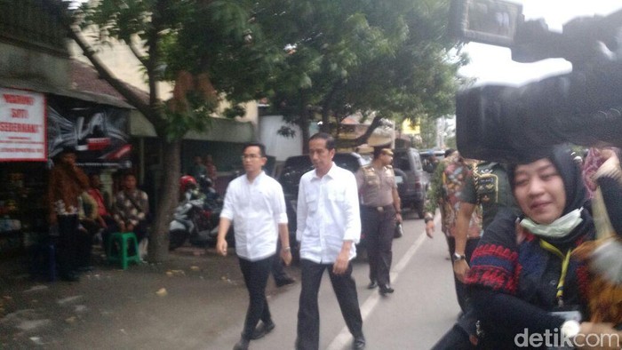 Jokowi berjalan kaki menuju Gedung Graha Saba Buana yang jaraknya sekitar 100 meter dari kediaman. Dia bersama Gibran mengenakan kemeja putih lengan panjang dengan celana hitam.