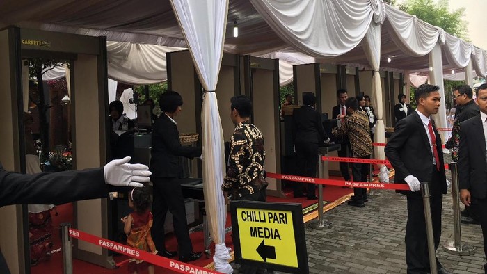 Para tamu yang akan masuk gedung harus melewati pintu pemindai (security door) yang dijaga oleh anggota Paspampres. Foto: Ray Jordan/detikcom