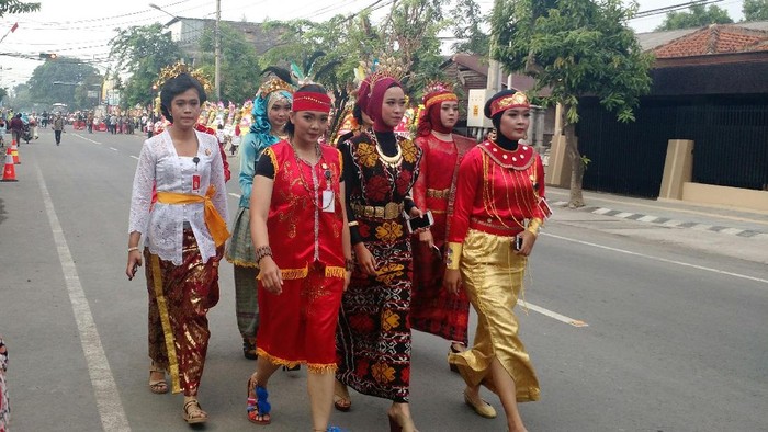 Mereka tampak mengenakan pakaian adat dari berbagai daerah di Indonesia, misalnya saja pakaian adat Dayak, Palembang, Jawa, Bali, dan sebagainya.
